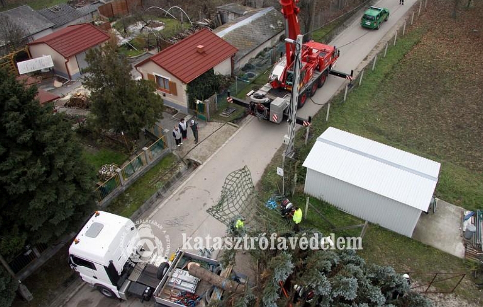 A felajánlás a Fő út és Dózsa György utca kereszteződésénél lévő családi házból érkezett, a munkálatokhoz a tűzoltóság autódarujára és magasból mentő létrájára is szükség volt. A 36 éves és 4,4 tonna súlyú ezüstfenyő több órás megfeszített munka eredményeként indulhatott útnak a rendőrség és a katonai rendészet biztosítása mellett. Az Országház előtt a Fővárosi Katasztrófavédelmi Igazgatóság technikai eszközei és tűzoltói várják a fenyőfát, akik a felállítását fogják elvégezni.