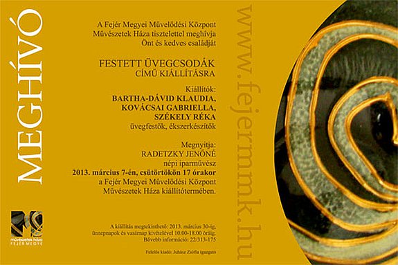 Üvegfestők, ékszerkészítők alkotásaiból nyílik kiállítás a Művészetek Házában március 7-én, csütörtökön 17 órakor. A tárlatot Radetzky Jenőné népi iparművész nyitja meg. Az alkotásokat Bartha-Dávid Klaudia, Kovácsai Gabriella és Székely Réka készítették, a megnyitóra minedenkit szeretettel várnak.