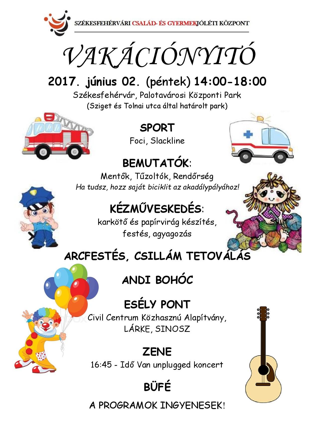 Június 2-án, pénteken 14.00-18.00 óra között a Palotavárosi Központi Parkba várják a vakációzó gyerekeket és családjaikat. Szórakoztató programokat, hasznos szabadidő eltöltést egyaránt kínál a rendezvény. Lesz foci és slackline, bemutatót tartanak a mentők, a tűzoltók és a rendőrök, várható még festés, agyagozás, bekapcsolódnak különféle civil szervezetek, illetve lesz bohóc, koncert és sok egyéb program.A nyári szünetben a Székesfehérvári Család- és Gyermekjóléti Központ Ifjúsági Közösségi Tere meghosszabbított nyitva tartással várja a fiatalokat a Tolnai u. 16/1. szám alatt. Június 26-a és augusztus 18-a között, hétfő, szerda és csütörtöki napokon 8:00-tól 16.00 óráig fogadják az érdeklődőket. Változatos programokat, társas- és sportjátékokat, kézművesedést kínálnak a szabadidő hasznos eltöltésére.