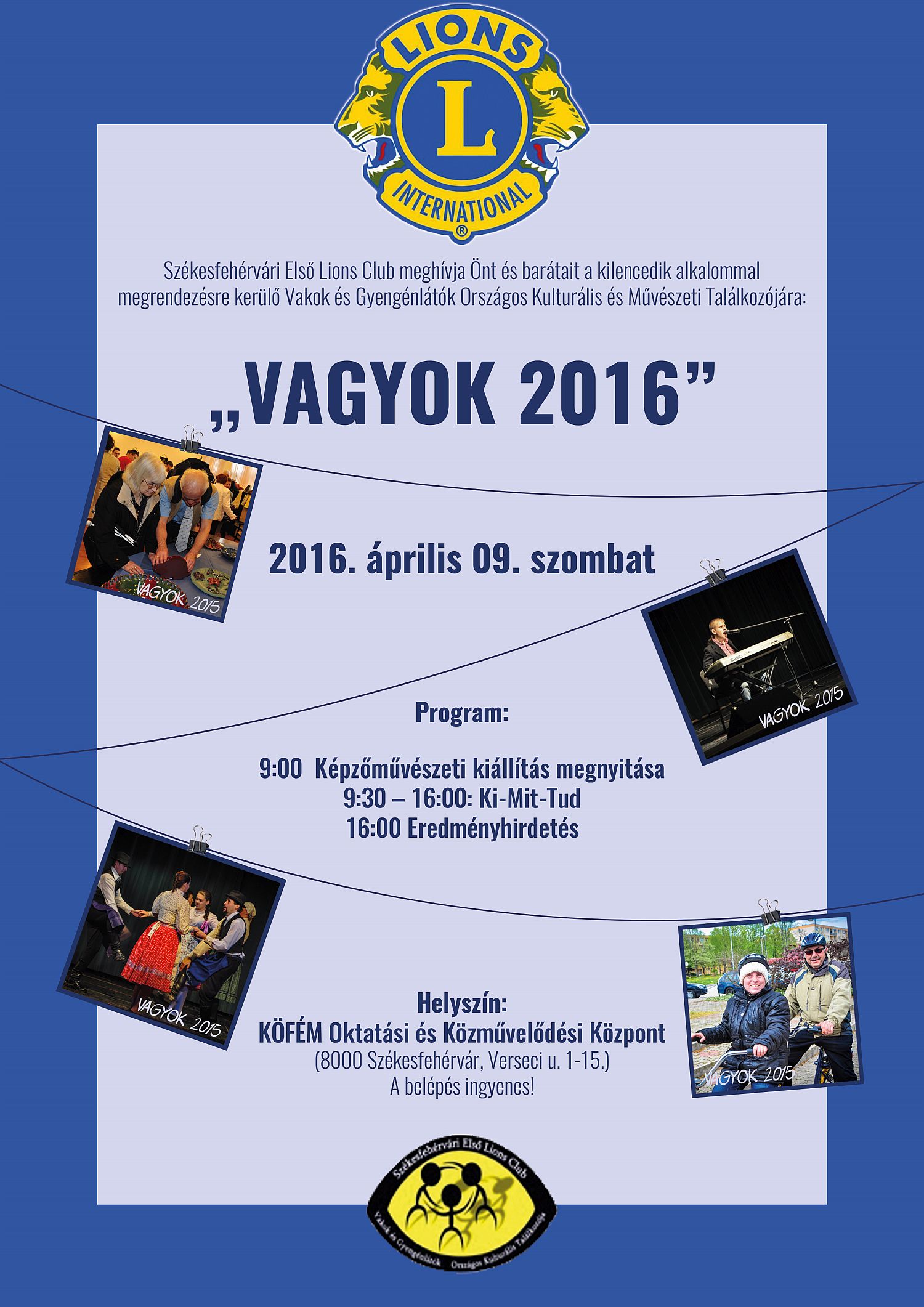 A Székesfehérvári Első Lions Club idén már kilencedik alkalommal rendezi meg a látássérült, sérült és hátrányos helyzetű embertársaink számára az esélyegyenlőség jegyében a bemutatkozás és figyelemfelkeltés lehetőségét a „VAGYOK 2016” rendezvényt. A fehérvári az egyetlen olyan országos program, ahol megmutathatják magukat, tehetségüket és rátermettségüket is.