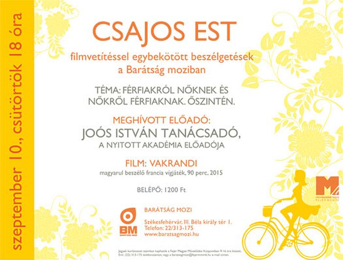 Folytatják a népszerű Csajos estek sorozatát a Barátság Moziban. Szeptember 10-én, csütörtökön 18 órakor Joós István tanácsadó, a Nyitott Akadémia előadója beszél férfiakról nőknek és nőkről férfiaknak. Az előadás után a Vakrandi című magyarul beszélő francia vígjátékot vetítik, a belépőjegy 1.200 Ft.