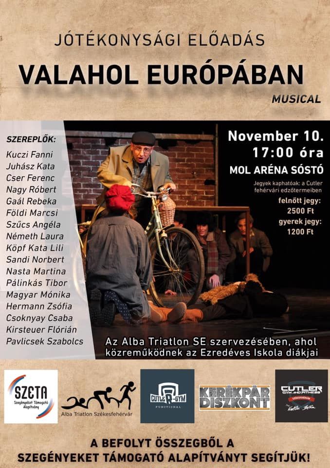 A júniusi A padlás című előadás után újabb jótékonysági színházi előadást szervez a székesfehérvári Alba Triatlon SE. Vasárnap a MOL Aréna Sóstóban a Valahol Európában című musicalt mutatja be az Imre Sándor Szeretetszínház, az esemény bevételéből a SZETA rászoruló családjaiban élő gyermekeknek vásárolnak majd kerékpárokat.