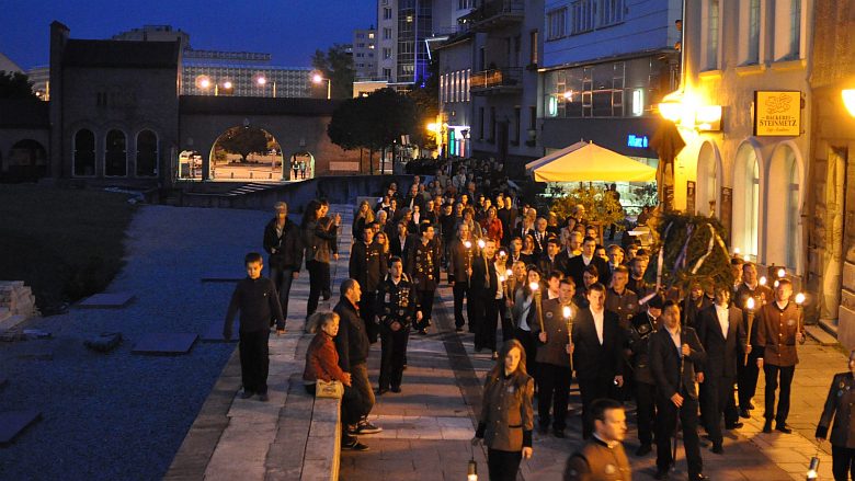 A végzősök az iskola előtt sorakoztak fel a fáklyát tartó balekok, kohlenbrennerek sorfala között és a szalamanderes, fáklyás menet a Városháztérre érkezett. A menet elején vitték Magyarország és az intézmény zászlaját, amit a szalamander és a májusfa követett. A végzősök után a volt hallgatók, veteranissimusok, a tanári kar és a vendégek csoportja vonult.