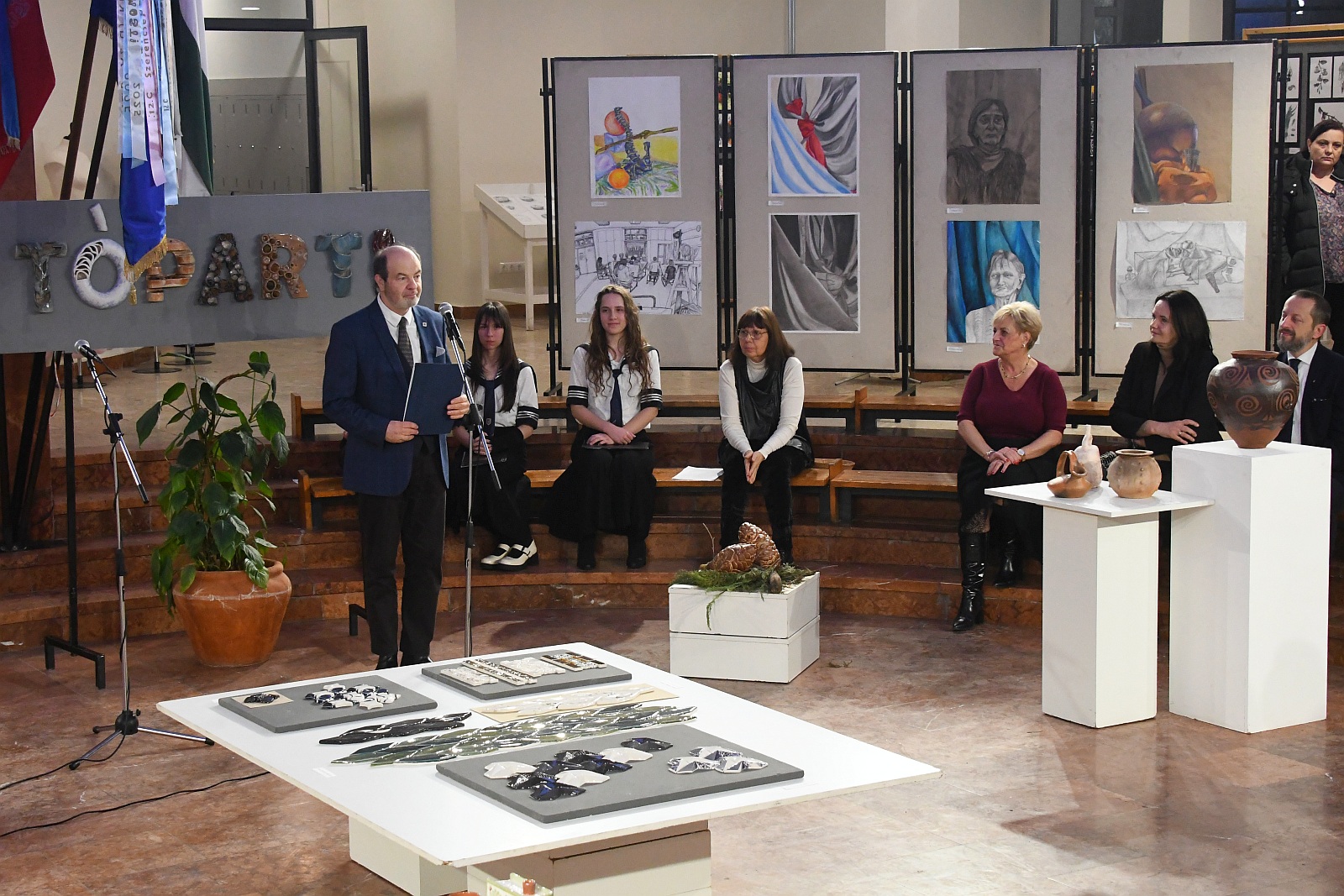 A megnyitó a diákok zenés, prózai, verses műsorával kezdődött, majd dr. Vizi László Tamásné, a gimnázium főigazgatója köszöntötte az esemény résztvevőit. „Ez a kiállítás nem csupán bemutató, hanem ünnep is! Találkozás az alkotással, a figyelemmel végzett munkával és azzal a belső úttal, amelyre a művészet hívja az embert!” – hangsúlyozta, majd Paul Klee svájci festőművészt idézve hozzátette: "A művészet nem a láthatót adja vissza, hanem láthatóvá tesz”. Mint mondta, a művészeti tagozat ifjú alkotóinak munkái éppen ezt a láthatóvá válást hordozzák magukban. Nem csupán kész művek szerepelnek a kiállításon, hanem egy tanulási, alkotói folyamat lenyomatai, kísérletezés, kérdésfeltevés, útkeresés. A tanulók elsajátítják a szakma alapjait, felelősségét és örömét, alkotásaikban pedig megjelenik az odaadás, a kitartás és a nyitottság. A főigazgató köszönetét fejezte ki a művészetis pedagógusoknak, valamennyi kollégájának és a nyitó műsor résztvevőinek.