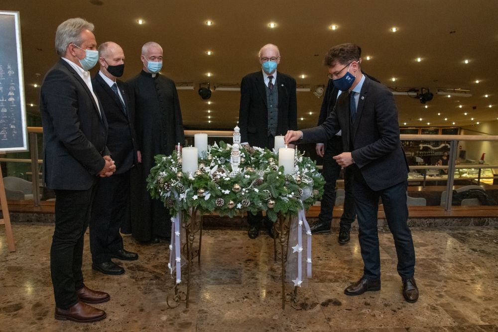 A maratont követően fellobbant az első gyertya lángja a színház adventi koszorúján. A program zárását követően a felolvasás résztvevői Tóth Tamás esperes, Bencze András evangélikus lelkész és Szász Zoltán református lelkész közreműködésével közösen gyújtották meg a színház adventi koszorúján az első gyertyát.