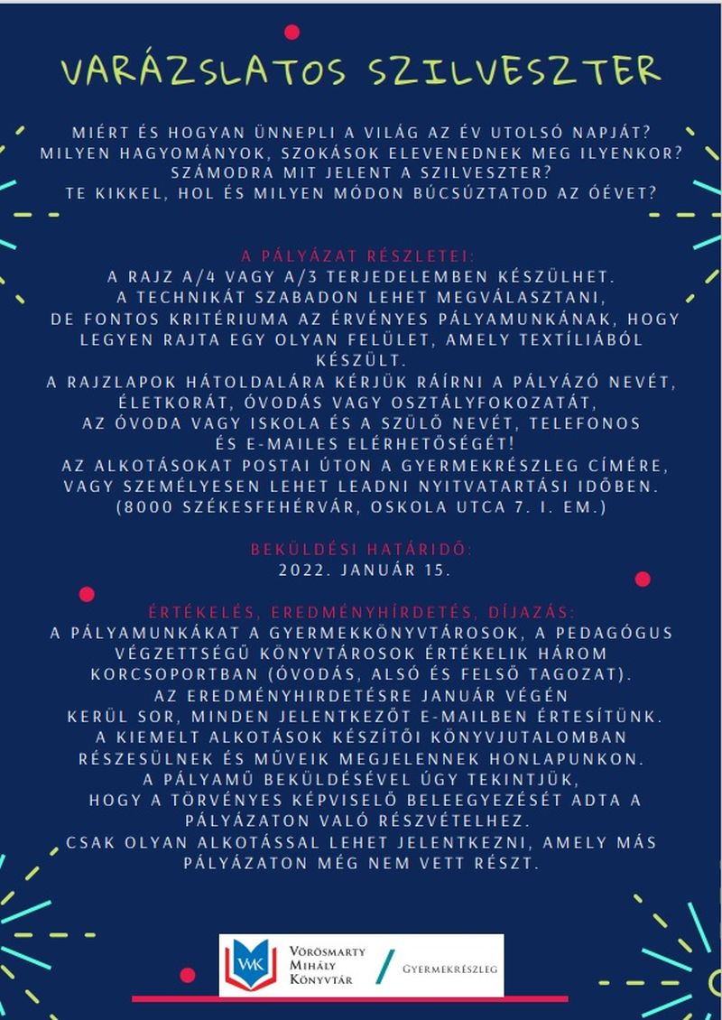 Varázslatos szilveszter névvel hirdetett rajzpályázatot a Vörösmarty Mihály Könyvtár. A pályázatra minden óvodás és általános iskolás gyermek művét várják, A4 és A3-as méretben.