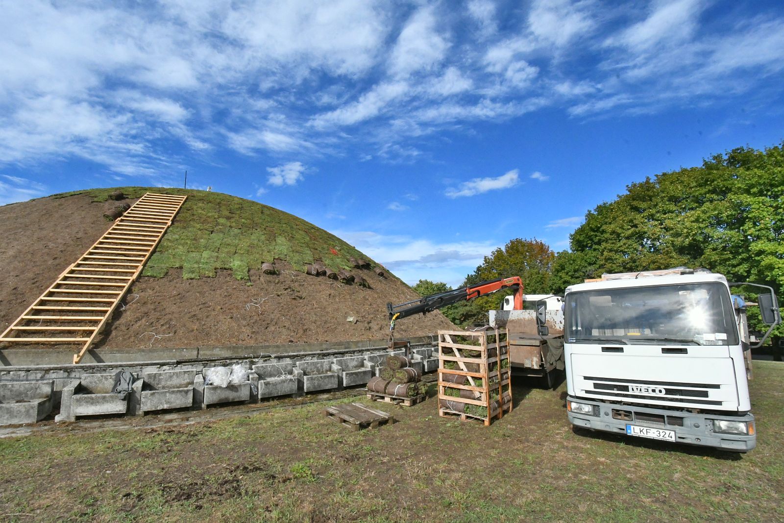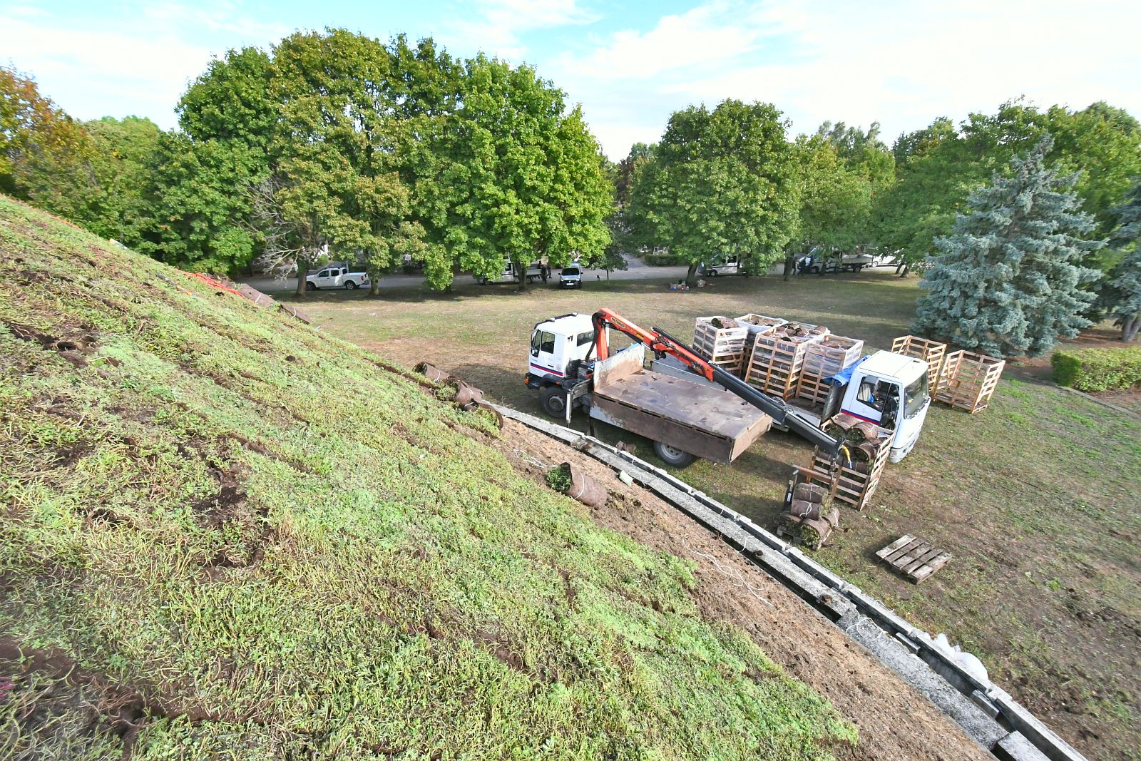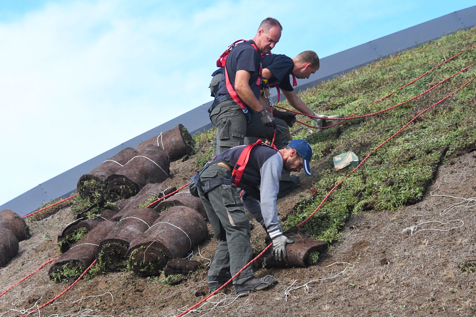 Lentről nem tűnik olyan nagynak, de hatalmas a területe a dombnak: több mint 1500 négyzetméteren kell leteríteni a Sedum szőnyeget és rögzíteni is, hogy a begyökeresedésig ne csússzon le a domoldalon.