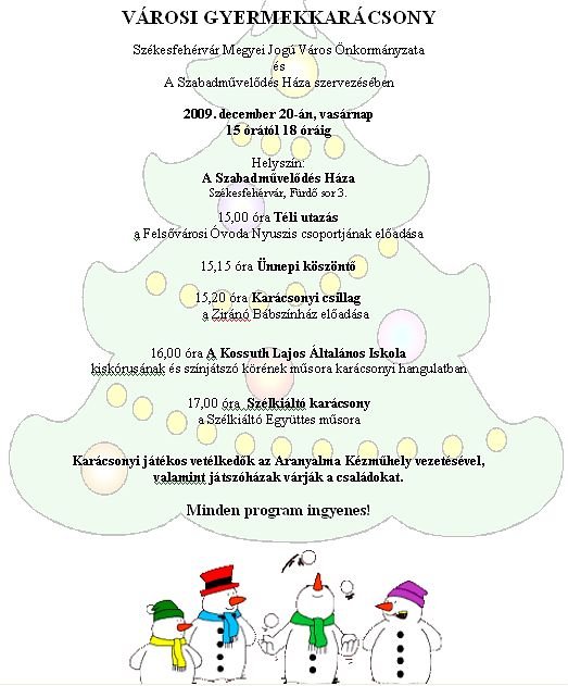 Székesfehérvár Önkormányzata és a Szabadművelődés Háza szervezi idén a Városi Gyermekkarácsonyt. December 20-án délután három órakor kezdődik a rendezvény a Szabadművelődés Házában. Itt karácsonyi gyermekelőadások mellett karácsonyi játékos vetélkedőkkel és játszóházzal várja a családokat az Aranyalma Kézműhely.