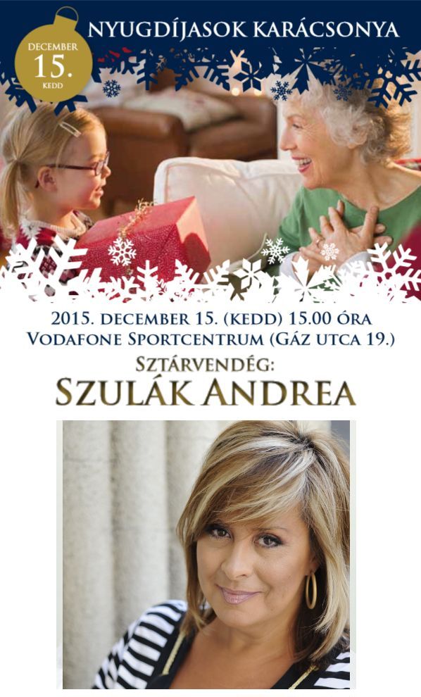 December 15-én, kedden délután a Vodafone Sportcentrumban Székesfehérvár Önkormányzata egy nagyszabású és színvonalas ünnepi műsorral kedveskedik a nyugdíjasoknak. A szervezők jövő kedden 15.00 órára várnak minden kedves érdeklődőt a Városi Nyugdíjas Karácsonyra. A program sztárvendége, az EMeRTon-díjas énekes és színművésznő, Szulák Andrea lesz.