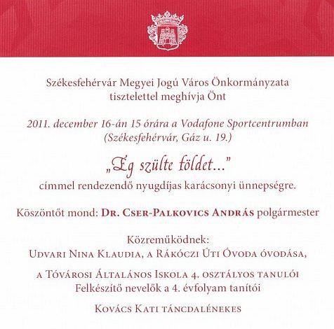 "Ég szülte földet..." címmel rendez karácsonyi ünnepséget a Székesfehérváron élő idős embereknek a város önkormányzata. 2011. december 16-án, pénteken 15 órától Kovács Kati táncdalénekes koncertjével és gyermekműsorral várják a nyugdíjasokat a Vodafone Sportcentrumban (ARÉV Sportcsarnok). A karácsonyi ünnepségen Kovács Kati táncdalénekes is fellép! Mindenkit szeretettel várnak!
