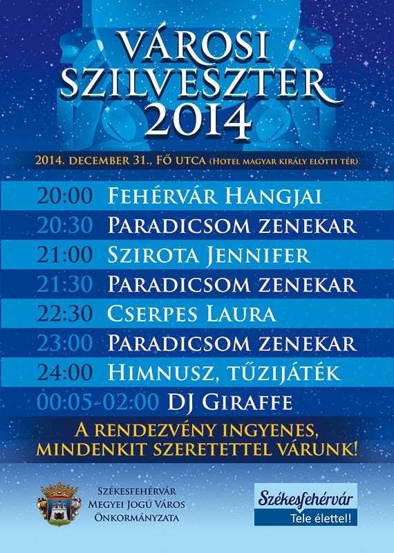 Színvonalas óév búcsúztató programot ígér december 31-én 20 órától hajnali kettőig a Városi Szilveszter a Magyar Király Szálló előtt felállított színpadon. Este nyolc órakor kezdődik a buli, amikor a Fehérvár Hangjai című tehetségkutató versenyből ismert fellépők lépnek színpadra. 20.30-tól, 21.30-tól, majd 23 órától a Paradicsom Zenakar szórakoztatja a jelenlévőket. Este kilenckor Szirota Jennifer műsora, majd pedig 22.30-kor Cserpes Laura köszönti műsorával az év utolsó órájában a székesfehérváriakat.