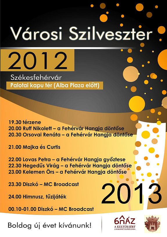 A hagyományokhoz hűen idén az év utolsó napjának éjszakáján is lesznek szilveszteri programok Székesfehérváron. Az óévbúcsúztató mulatság este fél nyolckor térzenével indul, majd nyolc órától a Fehérvár Hangja döntőseit, Ruff Nikolettet és Orsovai Renátát hallhatja a közönség. Majka és Curtis este kilenc órakor lép színpadra, majd tíz órától a Fehérvár Hangja győztese, Lovas Petra produkcióját láthatja a közönség. Féltizenegytől Hegedűs Virág és Kelemen Örs, a fehérvári tehetségkutató két döntőse énekel, majd éjfélig MC Broadcast szolgáltatja a zenét. Az éjféli tűzijáték után folytatódik a disco. A rendezvény ingyenes, mindenkit szeretettel várnak.