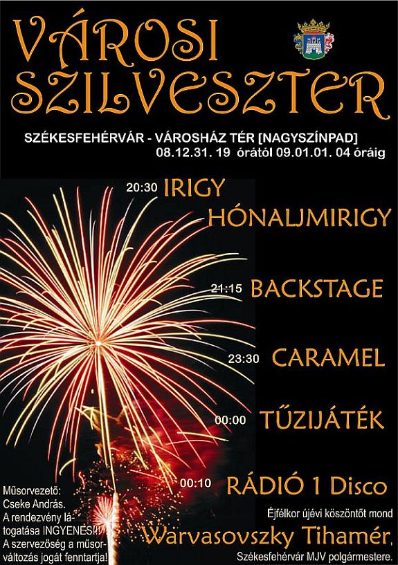 A hagyományokhoz hűen idén az év utolsó napjának éjszakáján is lesznek szilveszteri programok a Főtéren. Az óévbúcsúztató mulatság este hét órától kezdődik: fellép az Irigy Hónaljmirigy, a Backstage és Caramel adja a Városház tér ez évi utolsó koncertjét. Éjfélkor természetesen lesz tűzijáték és a város polgármesterének újévi köszöntője után a Rádió 1 Disco kezdődik. A rendezvény ingyenes, mindenkit szeretettel várnak.