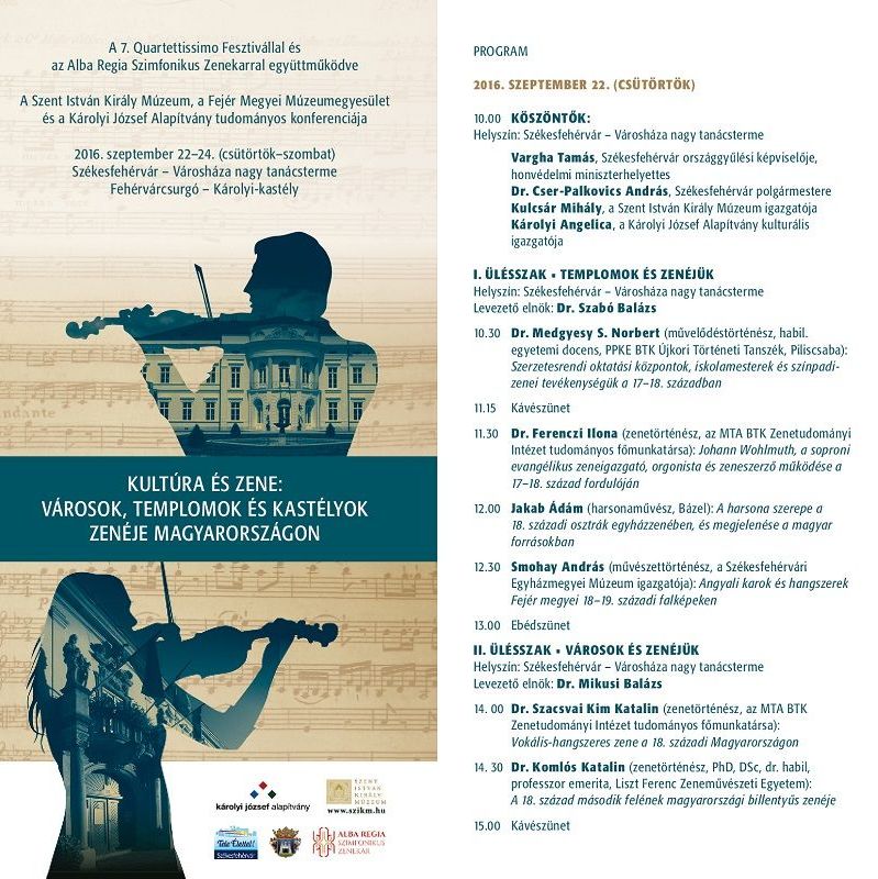 A tudományos szimpóziumot a 7. Quartettissimo Fesztivállal és az Alba Regia Szimfonikus Zenekarral együttműködve a Szent István Király Múzeum, a Fejér Megyei Múzeumegyesület, valamint a Károlyi József Alapítvány szervezi. A konferencia előadásai nyitottak, minden érdeklődőt szeretettel várnak, a koncertek pedig belépőjegy váltásával látogathatóak!