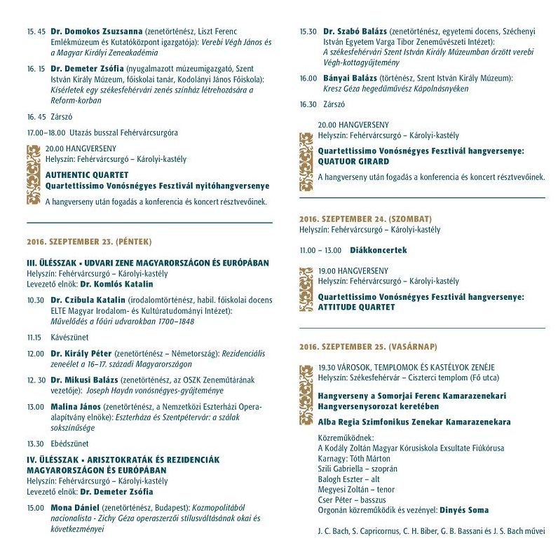 A pénteki ülést a Kastélyban tartják – a magyar és európai udvari zene, valamint az arisztokraták és rezidenciák jegyében. Az esti hangversenyt a Quatour Girard adja. A hétvégi programok között diákkoncertek és az Attitude Quartet csurgói előadása is megtalálható, vasárnap este pedig Székesfehérváron a Ciszterci templomban zárul hangversennyel a színvonalas rendezvény, amelyen az Alba Regia Szimfonikus Kamarazenekara lép fel J. C. Bach, J. S. Bach, Capriocornus, Biber és Bassani zenéjét tolmácsolva, orgonán közreműködik és vezényel Dinyés Soma.