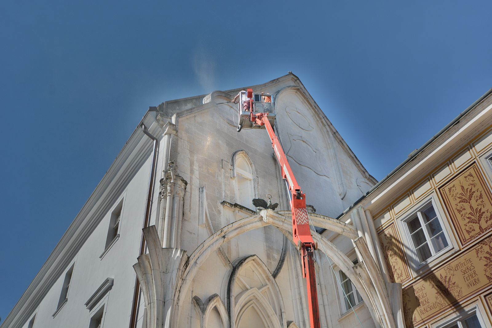 A Melocco Miklós által készített Mátyás király-emlékművet még június közepén kezdték tisztítani, de a magasabban található részeket csak nagy kosarasautóval lehet biztonságosan megközelíteni. Nyakas Pál kőfaragó mester a Városgondnokság megbízásából a szobrot magasnyomású mosóval tisztítja, majd vízlepergető réteggel kezeli. A munkával két-három hét alatt végeznek a szakemberek.