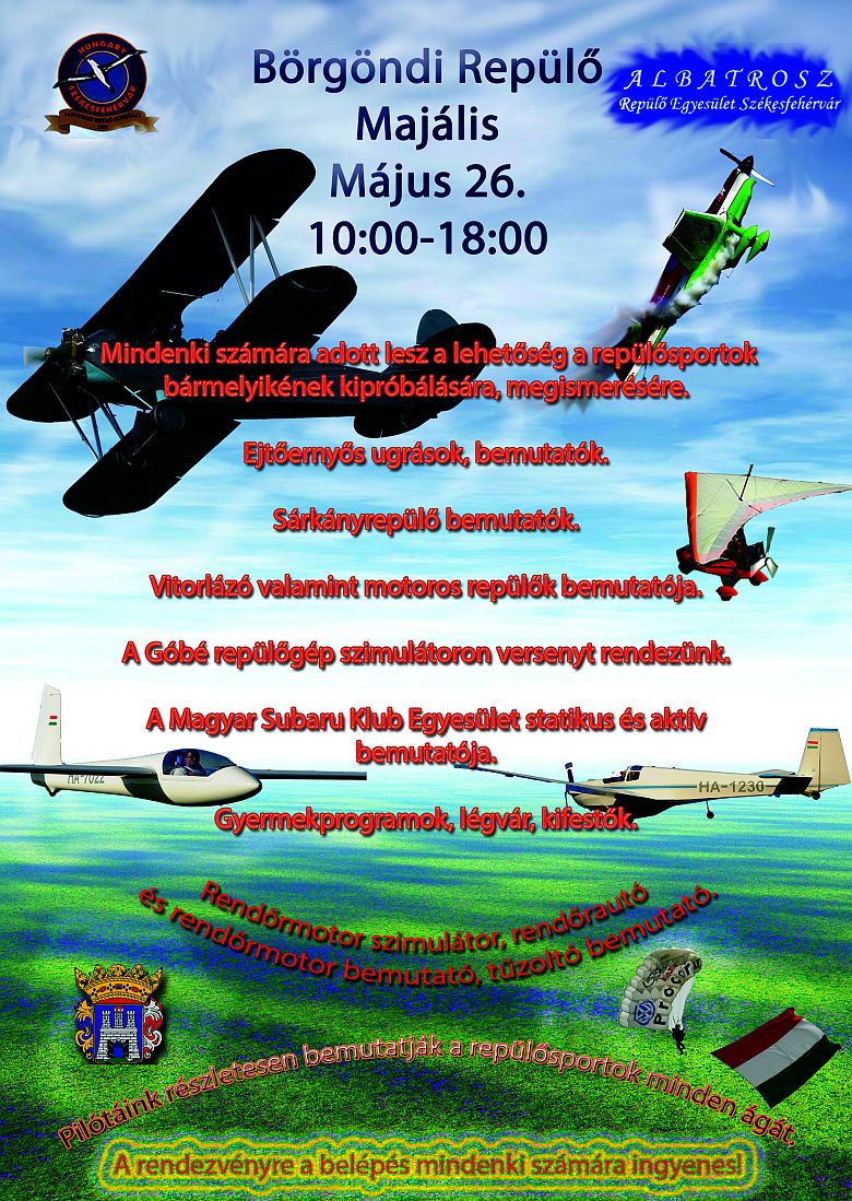 Az Albatrosz Repülő Egyesület idén is megrendezi hagyományos repülő majálisát, amelyre szeretettel várnak minden érdeklődőt május 26-án, 10 órától 18 óráig a Börgöndi Repülőtéren. A nyílt napon minden repülősportággal találkozhat a kilátogató közönség. Az egyesület szakemberei részletesen bemutatják a repülősportok minden ágát. A rendezvényre mindenkinek ingyenes a belépés!