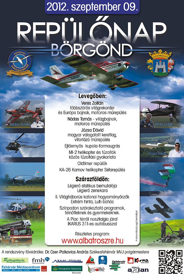 „A repülés minden ágát megismerhetik az érdeklődők a Börgöndi Repülőnapon. Itt lesz többek között Veres Zoltán többszörös világrekorder és Európa bajnok, valamint Nádas Tamás, a motoros műrepülés világbajnoka. Büszkén mondhatom, hogy az idei évben bemutatót tart egyesületünk tagja, Józsa Dávid is, aki a magyar vitorlázó műrepülés válogatott kerettagja.” – mondta el Szilády Dezső, az Albatrosz Repülő Egyesület elnöke. „Nemcsak a repüléssel kapcsolatos érdekességekre számíthatnak az érdeklődők, hiszen a gyermek és felnőtt szórakoztató programok mellett harcművészeti bemutatók zajlanak egész nap. Oldtimer repülőket is kiállítunk, sőt 9 órától óránként nosztalgia busz indul a Piac térről a Börgöndi repülőnapra, amelyet az eseményre szóló jeggyel vehetnek igénybe az utasok. A jegyekre nemcsak a belépés miatt érdemes vigyázni, hanem azért is, mert tombolaként is szolgálnak. A szerencsés nyertes pedig Veres Zoltánnal repülhet egy kört a sorsolást követően.” –tette hozzá Szilády Dezső.