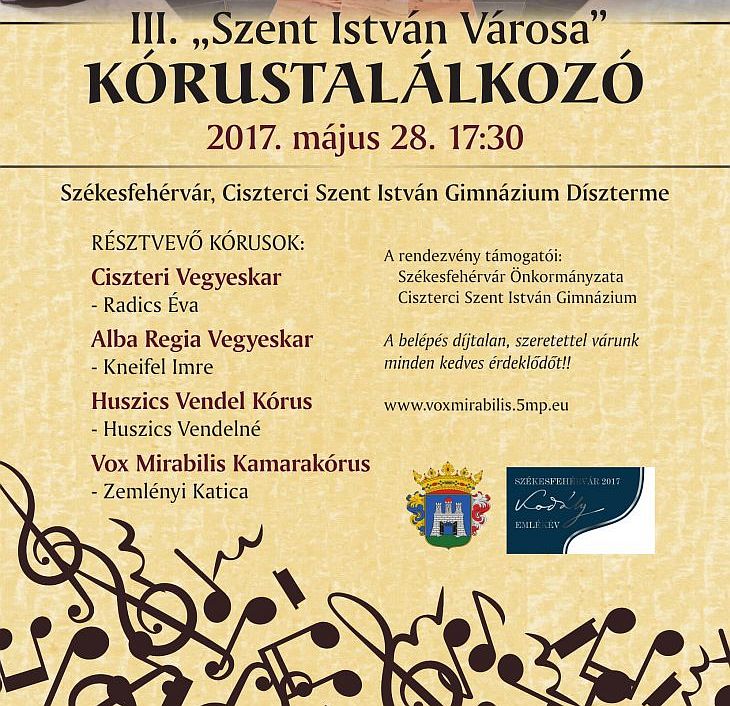 Május 28-án harmadik alkalommal rendezik meg a Szent István Városa kórustalálkozót a fehérvári vegyeskarok és kamarakórusok részére. A Ciszterci Szent István Gimnázium Dísztermében a Ciszterci Vegyeskar, az Alba Regia Vegyeskar, a Huszics Vendel Kórus és a Vox Mirablis Kamarakórus lép fel.