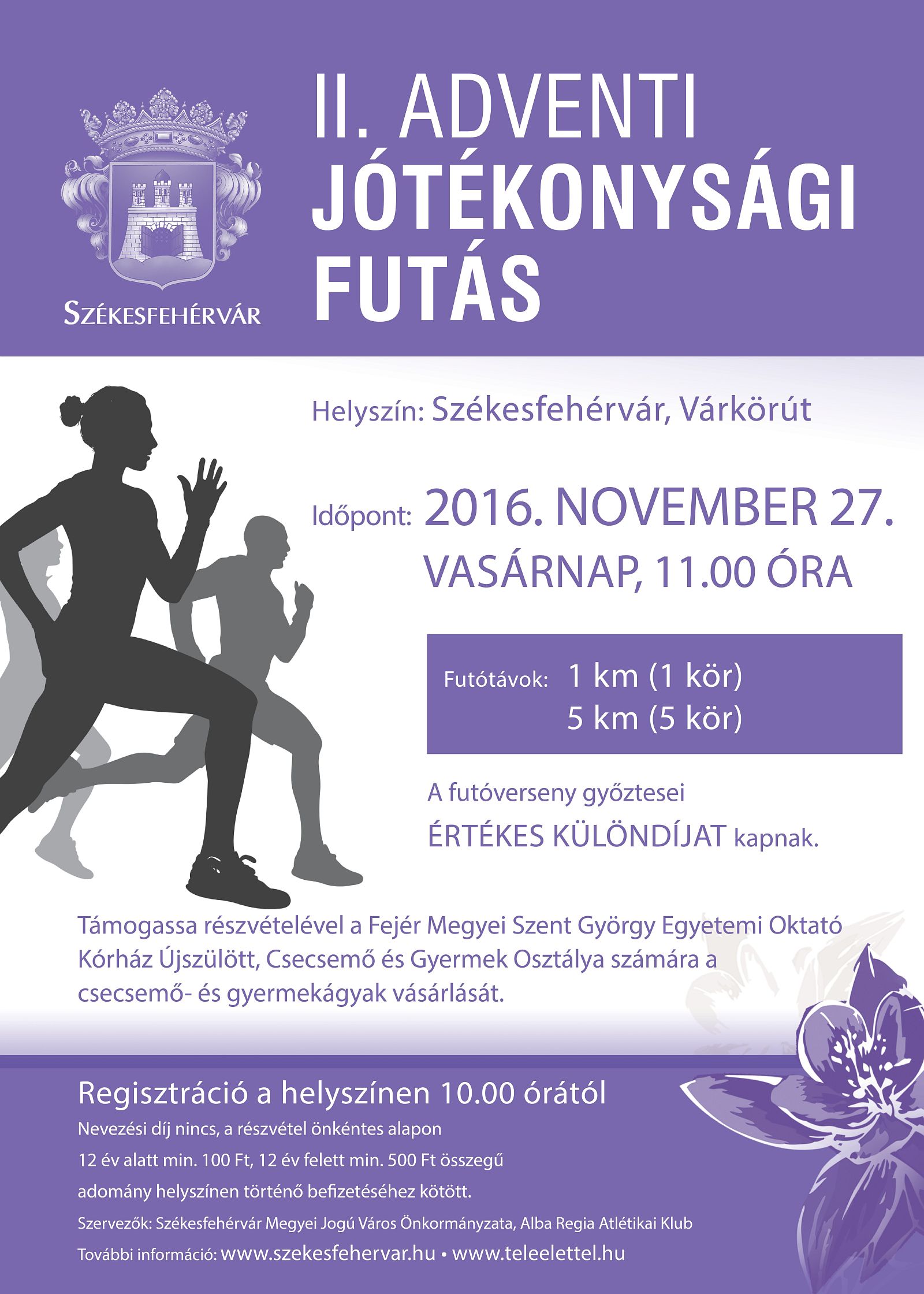 A II. Adventi Jótékonysági Futás november 27-én, Advent első vasárnapján lesz a Várkörúton. Tíz órától lehet a helyszínen regisztrálni, a mezőny pedig 11 órakor rajtol. A futók egy (1 km) vagy öt (5 km) kör megtételével teljesíthetik a kihívást. A nevezés a tavalyi évhez hasonlóan ingyenes lesz, a futáson a 12 év alatti gyerekek minimum 100 forint, a 12 év felettiek minimum 500 forint összegű jótékonysági pénzadomány felajánlásával vehetnek részt. Az adományokat a rajtszámok átvételekor és a rendezvény ideje alatt a helyszínen megtalálható adománygyűjtő dobozokban lehet elhelyezni. A futóverseny gyermek győztese a város ajándéka mellett este Székesfehérvár polgármesterével közösen kapcsolhatja fel a város adventi fényeit, a felnőtt győztes pedig két belépőjegyet kap a Jótékonysági Estélyre.