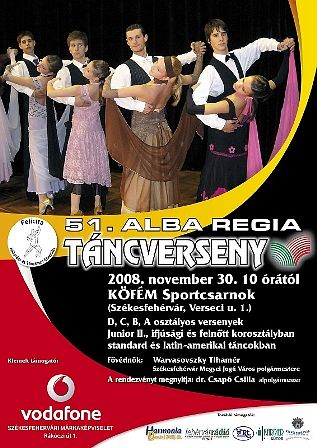 November 30-án vasárnap rendezik az 51.Alba Regia ORszágos Táncversenyt a Köfém Sportcsarnokban. A "D", "C", "B" és "A" osztályos versenyek mellett junior II, ifjúsági és felnőtt korosztályos táncosokkal, illetve standard és latin-amerikai táncokkal is találkozhat a látogató. Belépőjegy: 1500.- Diák-és nyugdíjas kedvezményes jegy: 1000.-