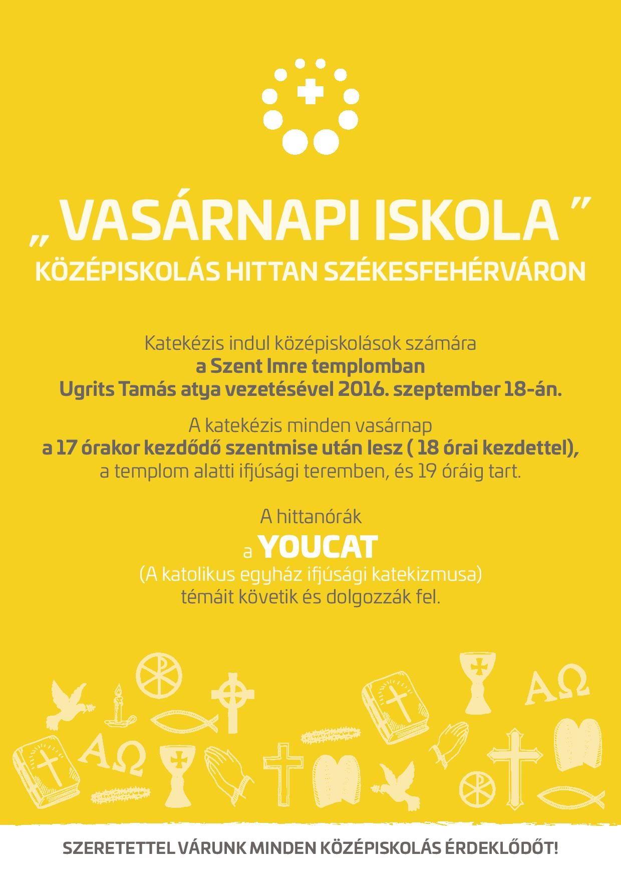 Szeptember 18-án katekézis indul középiskolások számára a Szent Imre templomban Ugrits Tamás atya vezetésével. A katekézis minden vasárnap a 17 órakor kezdődő szentmise után lesz 18 órai kezdettel, a templom alatti ifjúsági teremben, és 19 óráig tart. A hittanórák a YOUCAT - a katolikus egyház ifjúsági katekizmusa- témáit követik és dolgozzák fel.