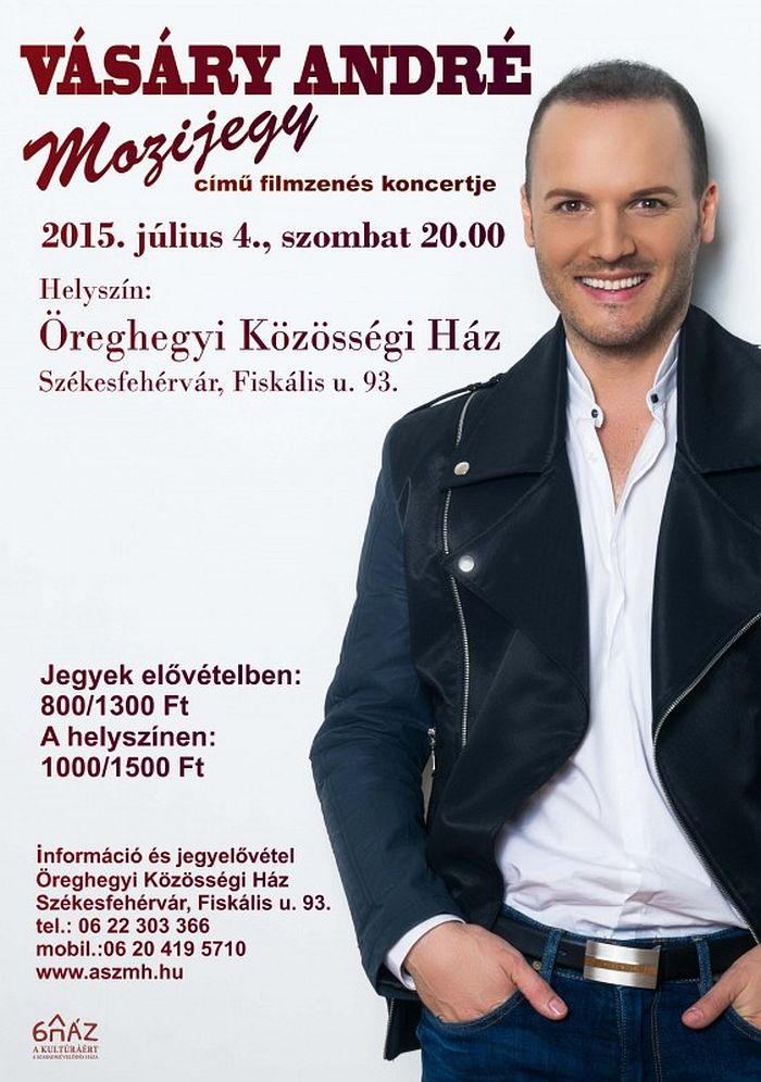 Az Öreghegyi Közösségi Házban Vásáry André filmzenés koncertjére várják a közönséget július 4-én, 20 órakor. Emblematikus mozifilmek nagy sikerű dalait hallhatják az érdeklődők ezen az estén. Vásáry André férfi szoprán énekes, aki immár három arany és egy platina lemez büszke tulajdonosa, mostani népszerűségét több mint 12 év kemény munkával alapozta meg.