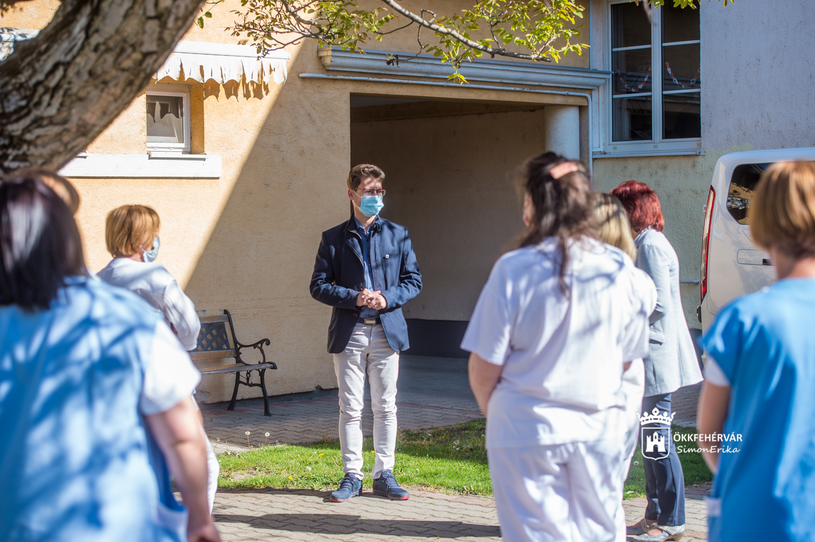 A Rehabilitációs Központba vitt védőfelszerelést Jakabné Major Erzsébet vette át. Elmondta, hogy a bentlakó ellátottak számára nagy könnyebbség a helyzet elviselésében, hogy ki tudnak menni a kertbe, ha jó idő van.