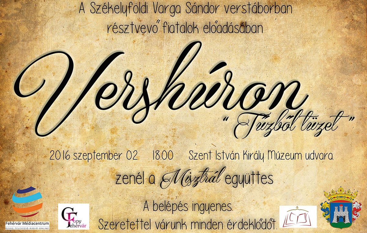 Zenés irodalmi esten lépnek fel a Fehérvári Versünnepen és a Székelyföldi Varga Sándor Verstáborban részt vett fiatalok. A „Vershúron” című gálára a Szent István Király Múzeum Díszudvarán kerül sor szeptember 2-án, pénteken 18.00 órától. A programon fellép a Misztrál Együttes is, szeretettel várnak minden érdeklődőt!