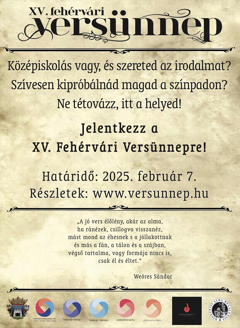 A Fehérvár Médiacentrum Kft. a Székesfehérvári Egyházmegyével, Székesfehérvár Megyei Jogú Város Önkormányzatával, a Szent István Hitoktatási és Művelődési Házzal, a Vörösmarty Színházzal, a Szent István Király Múzeummal és a SZÉPHŐ Zrt.-vel együttműködve ismét Fehérvári Versünnepet szervez.