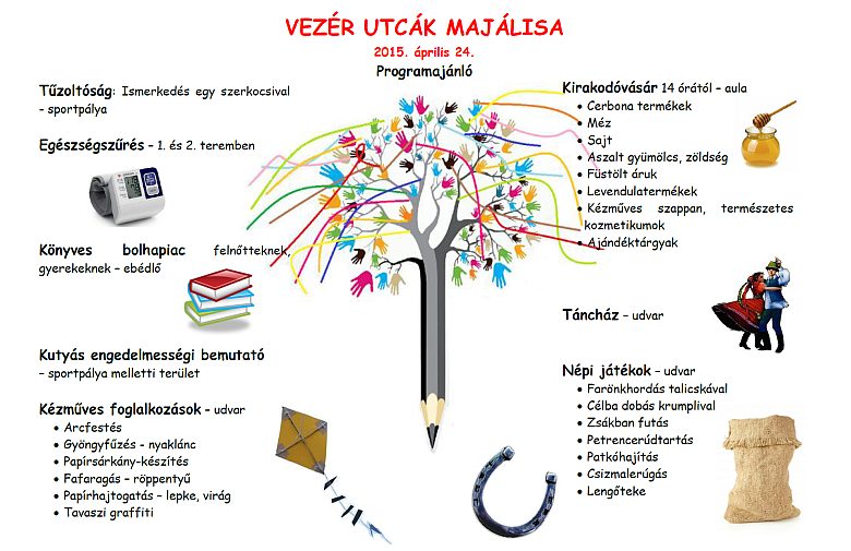 A Vezér utcák majálisát rendezik meg április 24-én a Hétvezér Általános Iskolában, ahol többek között könyves bolhapiac, kutyás engedelmességi bemutató, kézműves foglalkozások, kirakodóvásár és táncház is lesz. Az egészségszűrés az iskola 1-es és 2-es termében lesz, míg a kirakodóvásárt 14 órától az aulában rendezik meg.