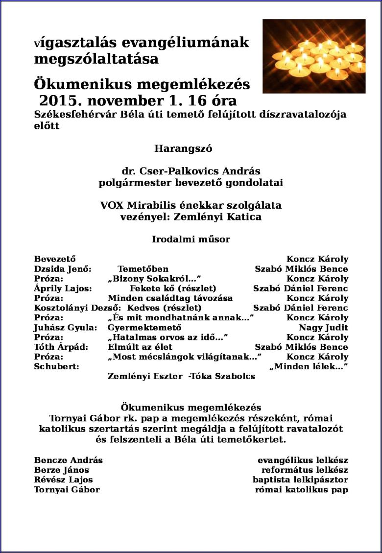 2015. november 1-jén, vasárnap 16.00 órakor kezdődik az ökumenikus megemlékezés a Béla úti köztemetőben. A "Vigasztalás evangéliumának megszólaltatása" című eseményt irodalmi műsor zárja, melyen a Vox Mirabilis énekkar is részt vesz. A megemlékezés részeként Tornyai Gábor atya római katolikus szertartás szerint megáldja a felújított ravatalozót és felszenteli a Béla úti temetőkertet.