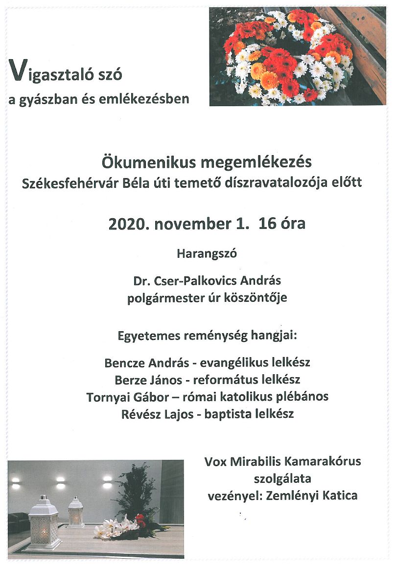 Székesfehérváron már hagyomány, hogy mindenszentek napján, november 1-jén ökumenikus megemlékezést tartanak. Ebben az évben ”Vigasztaló szó a gyászban és emlékezésben” címmel november 1-jén délután négy órától lesz ökumenikus megemlékezés a Béla úti köztemető feldíszített ravatalozó udvarán.