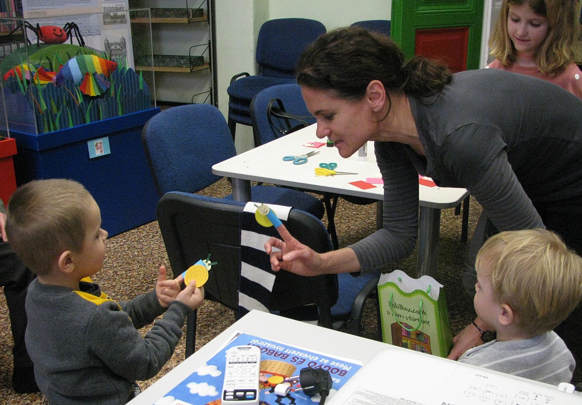 A Vörösmarty Mihály Könyvtár gyermekrészlegének munkatársa, Tóth Szilvia tematikus órában mutatta be és ismertette a kicsikkel a gyermekkönyvtár szolgáltatásait és használatát, majd a Bogyó és Babóca időszaki bábkiállítást nézték meg a gyerekekkel. Új bábokat is készítettek Babócáról.