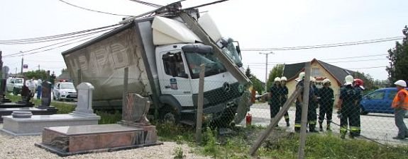 Az Új Csóri úton a városból kifelé haladó Mercedes teherautó az út menti árokba hajtott, ahol kidöntött egy villanyoszlopot. A darabokra törött betonoszlop ráfordult a két tonna vasárut szállító teherautóra. A tűzoltók a daruval először az oszlopot szedték le a Mercedesről, majd kiemelték a járművet az árokból. A teherautó sofőrje a balesetben könnyebben sérült. A műszaki mentés több mint két órán át tartott.