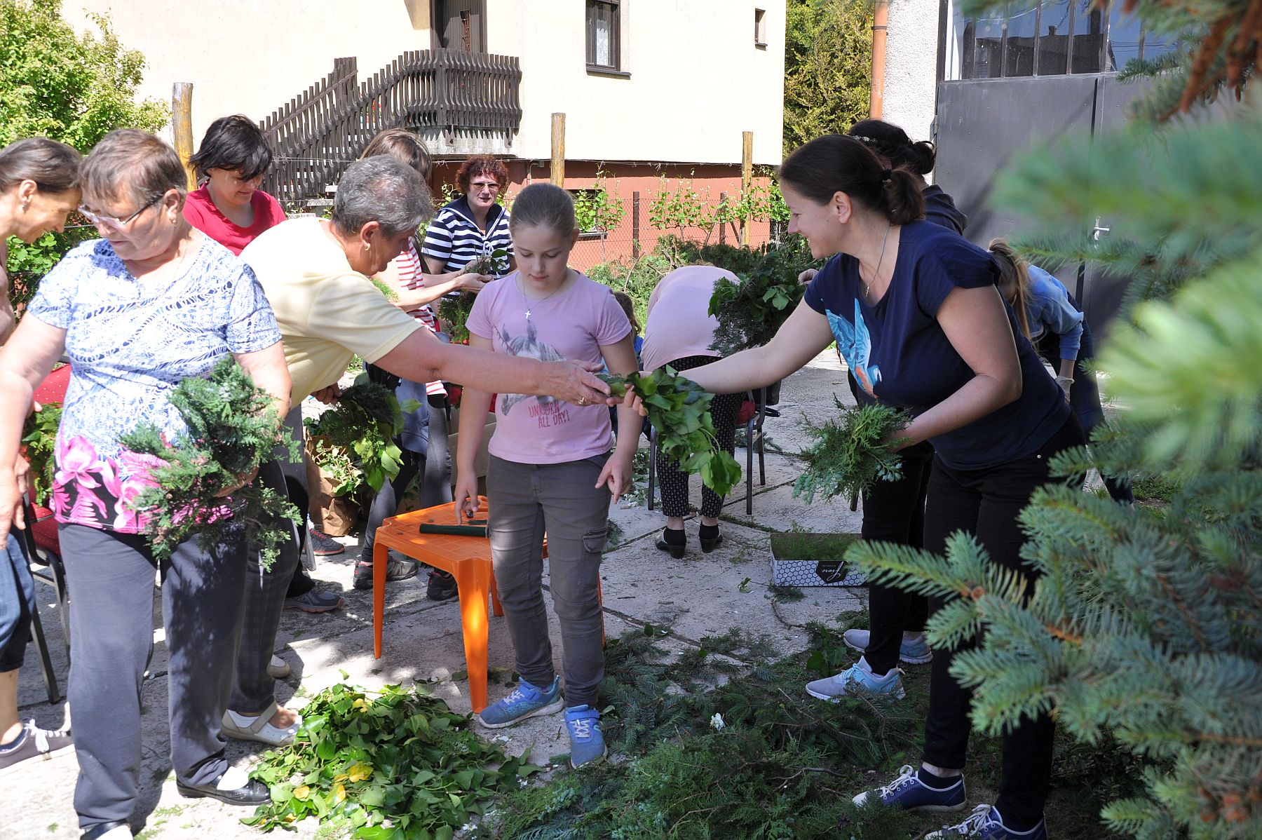 „Szombatra a plébánia valamennyi közössége számára meghirdettük a mai alkalmat, kértük, hogy ki amit tud hozzon a kertjéből virágokat különféle zöldeket, fenyő, vagy tujaágakat a kerítés, illetőleg a templombelső díszítéséhez, ez a zöld díszítés lesz majd később friss virágokkal teletűzdelve.” - foglalta össze a templomkertben kora délelőtt óta folyó munkálatok lényegét Fröschl Ádám, az Öreghegyi Plébánia ministránsvezetője.