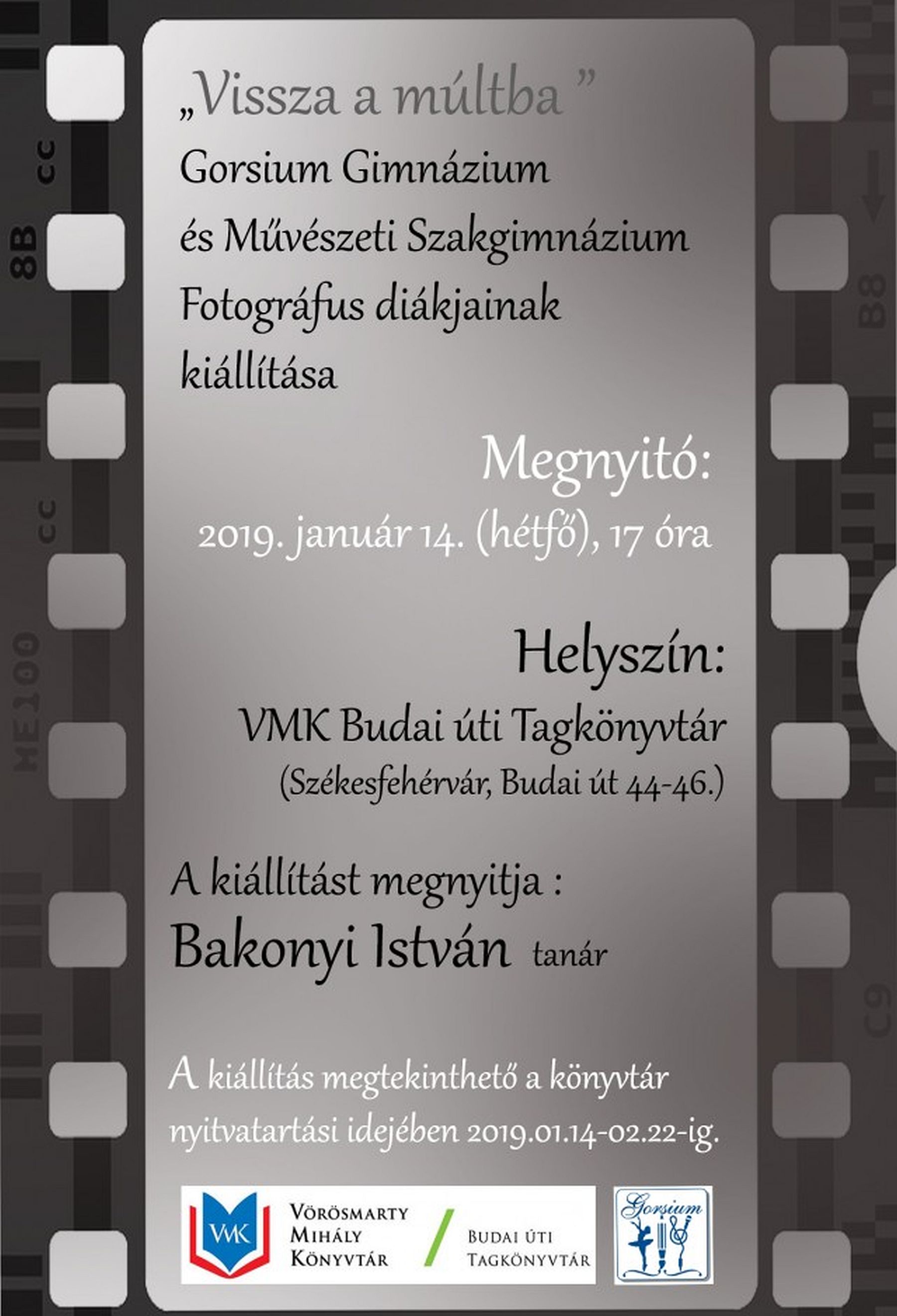 Január 14-én, hétfőn 17 órakor nyílik meg a Gorsium Gimnázium és Művészeti Szakgimnázium fotográfus diákjainak „Vissza a múltba” című kiállítása a Vörösmarty Mihály Könyvtár Budai úti Tagkönyvtárában. A tárlatot Bakonyi István, irodalomtörténész nyitja meg. A kiállítás február 22-ig tekinthető meg az intézmény nyitvatartási idejében.