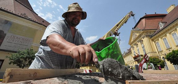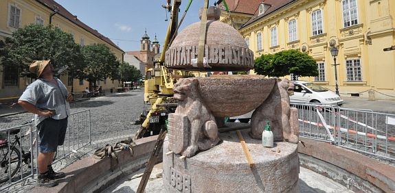 Visszahelyezték az Országalmát a Városház térre, melyet két napja szedett szét és szállított a műhelyébe Kocsis Balázs restaurátor. Az elmúlt két napban műhelyében tisztította meg az Országalma darabjait és csütörtökön kora délután kezdte el összerakni Ohmann Béla alkotását. A város jelképét még napokig restaurálják.