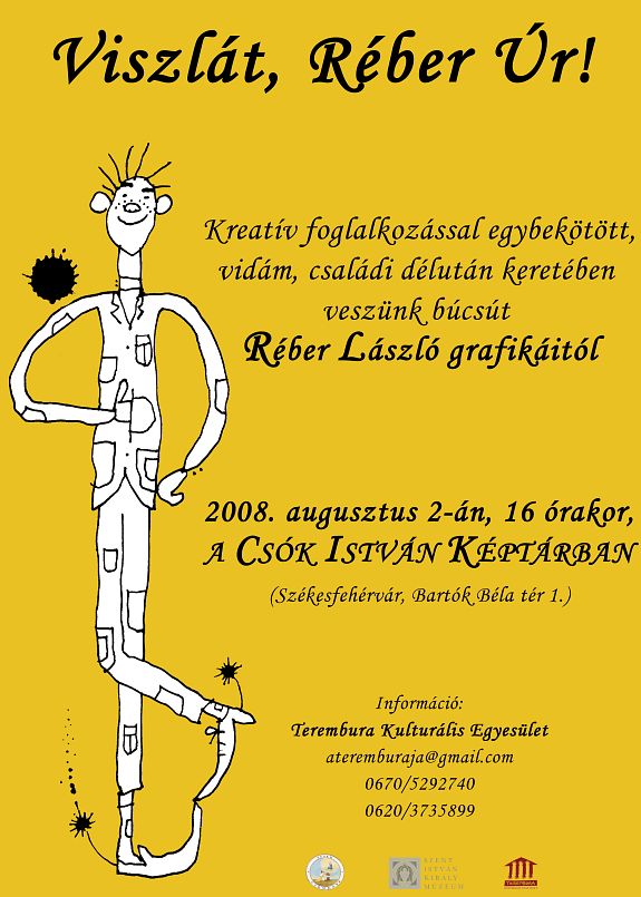 Viszlát Réber Úr címmel vidám családi délutánt szervez a Csók István Képtárban a Terembura Egyesület augusztus 2-án szombaton. A délután négy órakor kezdődő programmal szeretnének búcsút venni Réber László kiállításától, melyet április vége óta lehet megnézni a képtárban. Réber László gyermekkönyv illusztrációin generációk nőttek fel. Neve elválaszthatatlanul összeforrt Janikovszky Éva és Lázár Ervin nevével.