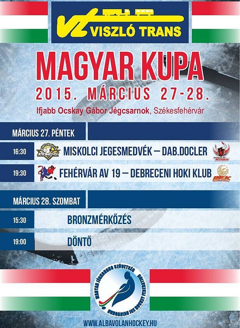 Pénteken délután megkezdődnek Székes- fehérváron a ViszlóTrans Magyar Kupa négyes-döntőjének küzdelmei a Fehérvár AV19, a Miskolci Jegesmedvék, a Dab. Docler és a Debreceni HK részvételével. A mérkőzésekre érvényesek a Fehérvár AV19 szezonbérletei. Pénztárnyitás pénteken és szombaton is az első mérkőzés előtt két órával.