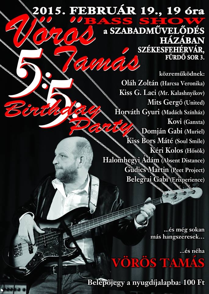 Vörös Tamás és vendégei zenélnek február 19-én A Szabad- művelődés Házában. A születésnapi buli este hét órakor kezdődik és minden valószínűség szerint országos szinten is egyedülálló "Bass Show" lesz Fehérváron. Olyan előadók érkeznek a fehérvári zenész 55. születésnapi koncertjére, akik különböző zenekarokban basszusgitároznak országszerte. A belépőjegy mindössze száz forint lesz.