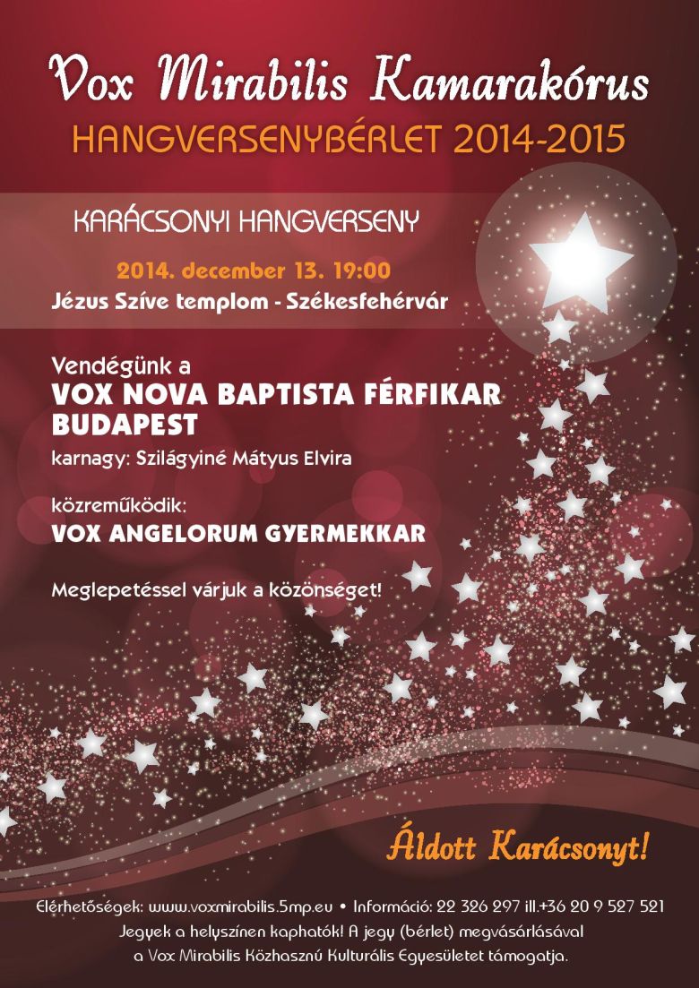 Szeretettel várja a családokat karácsonyi koncertjére a Vox Mirabilis Kamarakórus december 13-án 19 órakor a Jézus Szíve templomba. Az est vendége lesz a Vox Nova Baptista Férfikar Budapestről, a koncerten közreműködik a Vox Angelorum Gyermekkar. Jegyek és bérletek a helyszínen kaphatók!