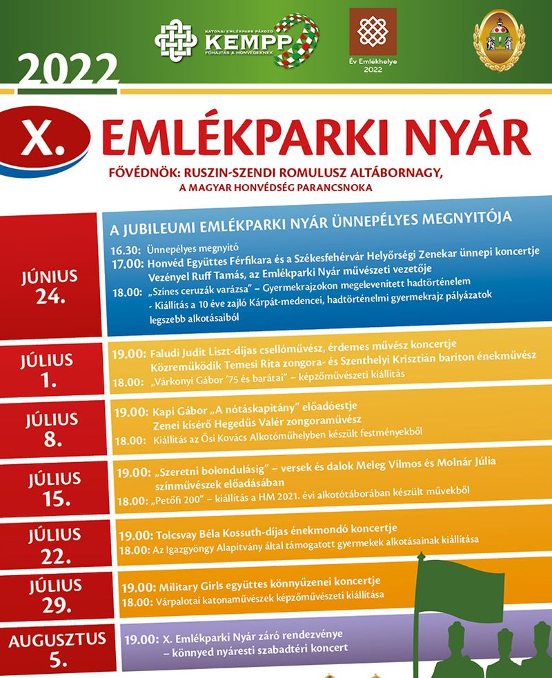 Június 24-én kezdődik és augusztus 5-ig tart a jubileumi X. Emlékparki Nyár kulturális rendezvénysorozat a Katonai Emlékpark Pákozd – Nemzeti Emlékhelyen. Ingyenes koncertekkel, kiállításokkal várják a közönséget.