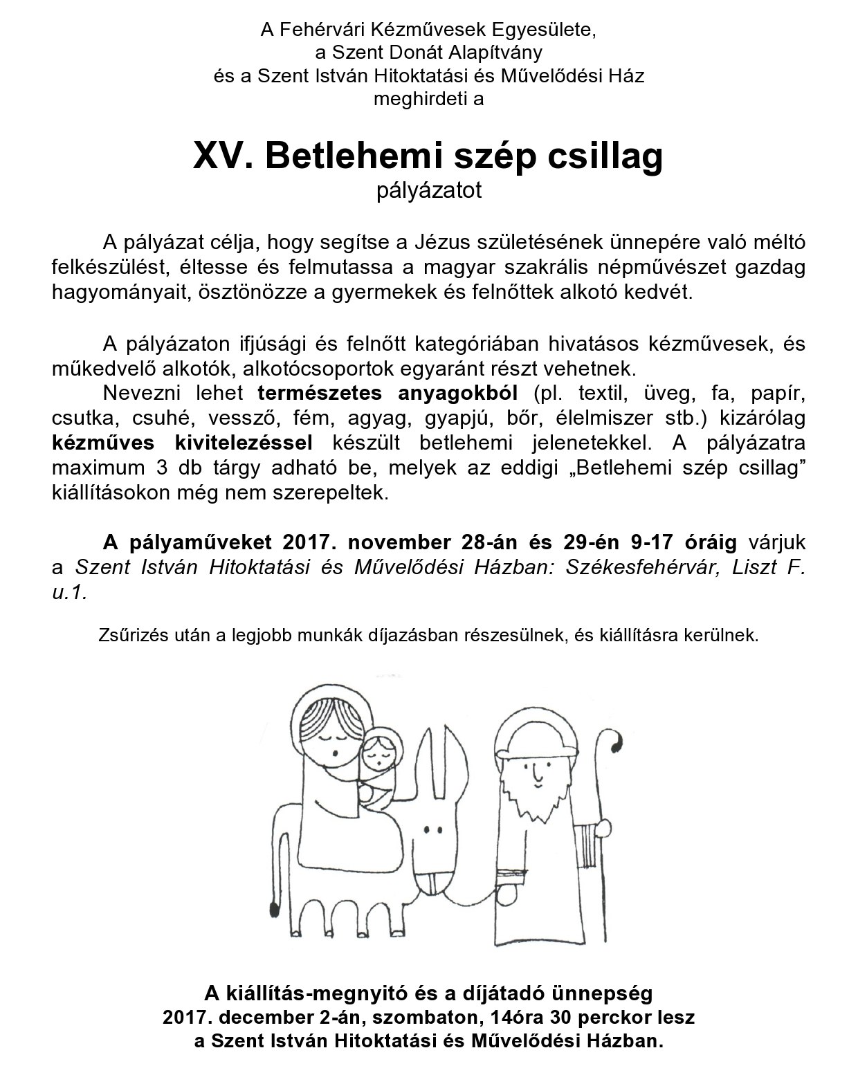 A Fehérvári Kézművesek Egyesülete, a Szent Donát Alapítvány és a Szent István Hitoktatási és Művelődési Ház idén is meghirdeti a XV. Betlehemi szép csillag pályázatot. A Betlehemi szép csillag pályázatra a kézművesek, műkedvelők vagy alkotócsoportok készítik el évről évre a betlehemi jeleneteket ábrázoló kézműves alkotásaikat természetes anyagokból, a magyar hagyományokat követve.