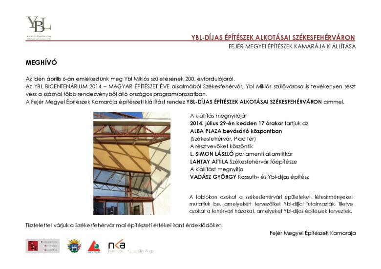 Építészeti fotókiállítás nyílik július 29-én kedden 17 órakor az Alba Plazában Ybl-díjas Építészek alkotásai Székesfehérváron címmel. A kiállítást az Fejér Megyei Építészek Kamarája készíti és rendezi az Ybl Bicentenárium alkalmából, megvalósítását a Nemzeti Kulturális Alap hozzájárulásával támogatja.