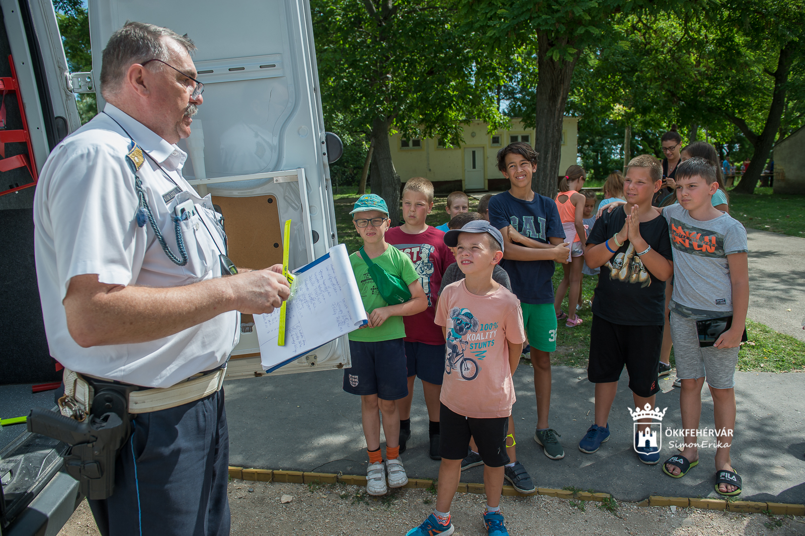 Fegyelmezettségre és figyelemre sarkallta a gyerekeket Májer László rendőr őrnagy is, aki egy rögtönzött akadálypályán a táborozók KRESZ-tudását, gyorsaságát és biciklizni tudását is tesztelte egy verseny keretében. A legügyesebbek pedig ebben a versenyben sem maradtak díjak nélkül!