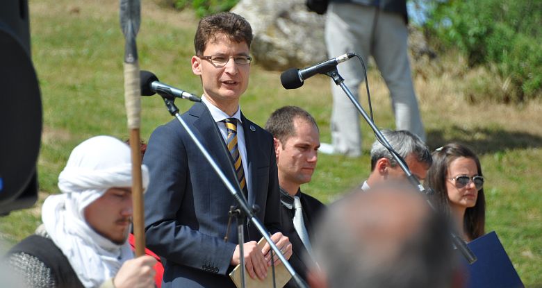 A Corpus Rézfúvós Quartet fanfárját követően részleteket olvasott fel az Aranybulla szövegéből Horváth Gergely előadóművész, majd Székesfehérvár polgármestere mondott ünnepi köszöntőt. Dr. Cser-Palkovics András kiemelte: „Mi itt, Európa közepén sokszor és sokat adtunk a magyar kultúrán, értékeken keresztül Európának is. Többek között 1222-ben a második írott alkotmányt. Az Aranybulla-emlékmű városunk egyik szimbóluma. Jelképezi Székesfehérvár történelmi főváros szerepét, és azt, hogy mi az ebből fakadó felelősséget tudatosan felvállaljuk. A két lobogó mától jelzi azt is a városba érkezőknek, hogy a koronázóváros szertettel fogadja őket, de elvárja az ebből adódó tiszteletet is. Ez az, amit mi a 2013-as Szent István Emlékévben megfogadtunk. Számomra nagy öröm, hogy ilyen sok fiatal vett részt a mai ünnepségen, hiszen ők fiatal felnőttként, vagy már a város irányítóiként viszik tovább ezeket a gondolatokat a 2022-es és a 2038-as emlékévben.”