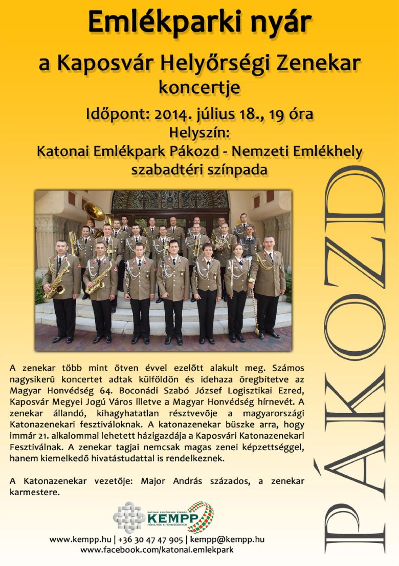 Ugyancsak tartalmasan tölthetik idejüket, akik július 18-án, pénteken ellátogatnak a pákozdi Katonai Emlékparkba. 19.00 órától az Emlékparki Nyár keretében a Kaposvár Helyőségi Zenekar lép fel a szabadtéri színpadon. A több mint ötven éves zenekar kihagyhatatlan résztvevője a katonazenekari fesztiváloknak, számos koncertet adott bel- és külföldön egyaránt.