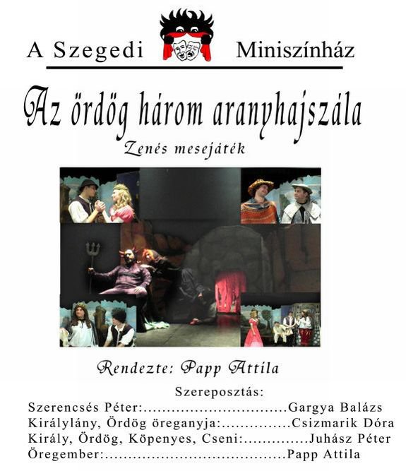 A Szegedi Miniszínház előadásában láthatják a gyerekek "Az ördög három aranyhajszála" című zenés mesejátékot a Szent István Művelődési Házban 2011. április 28-án (csütörtökön) 10.00 órától. A molnárlegény egy jóslat szerint feleségül veszi a király lányát, ám a király inkább elpusztítaná a legényt, mintsem hozzáadná a kérőhöz szeretett gyermekét. A házasság feltétele, hogy a fiúnak el kell hoznia az ördög három aranyhajszálát. A varázslatos Grimm-mese feldolgozását izgalmas fordulatok, vidámság jellemzi.
