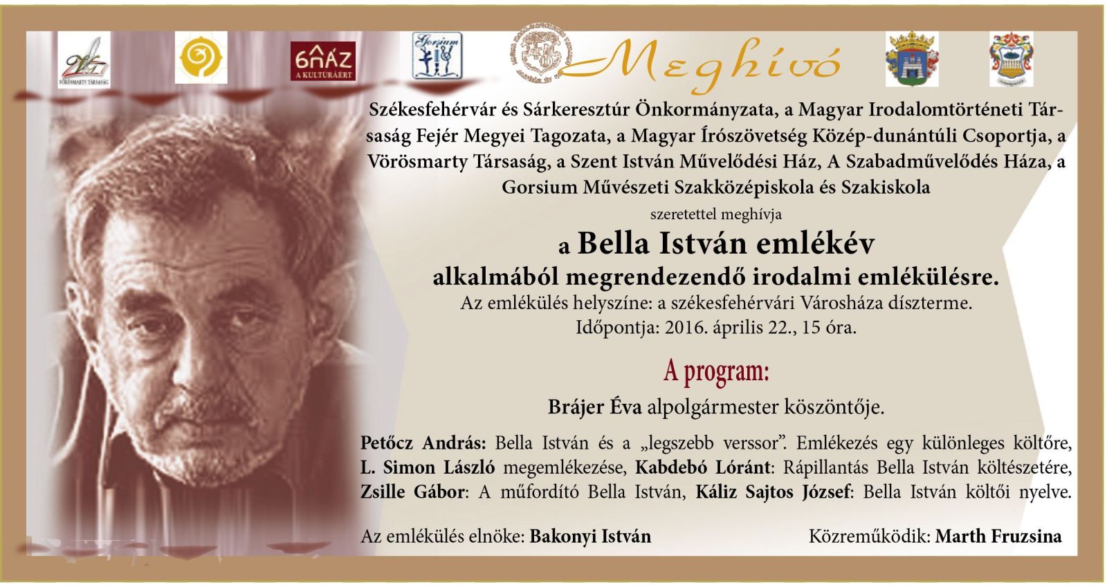 A Bella István emlékév alkalmából irodalmi emlékülés lesz a Városháza Dísztermében április 22-én, pénteken 15 órától. Brájer Éva alpolgármester köszöntője után a költő életpályájával, műveivel, műfordításaival kapcsolatos előadások hangzanak el Petőcz András, L. Simon László, Kabdebó Lóránt, Zsille Gábor és Káliz Sajtos József részvételével, az emlékülés elnöke Bakonyi István lesz.